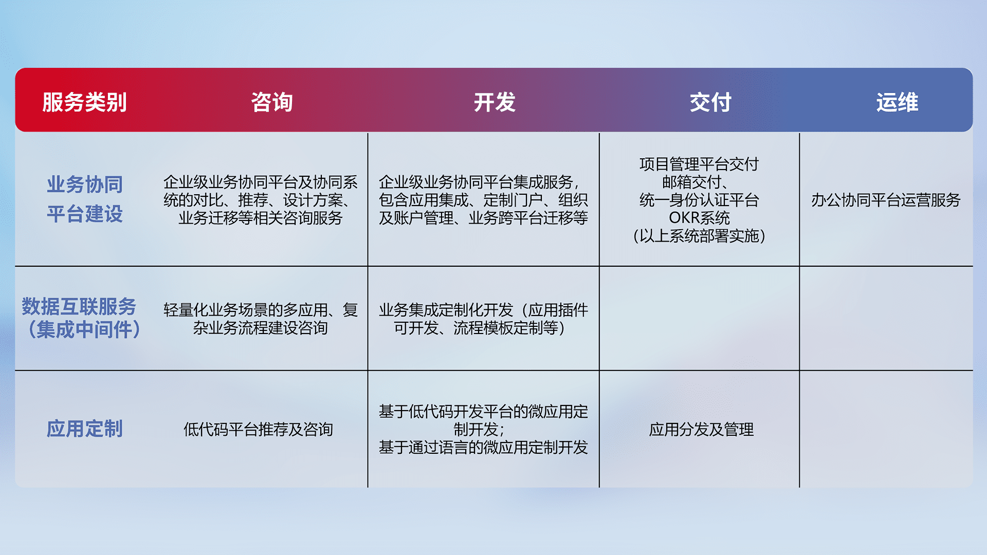 针对钉钉、、企微、、、IDaas等平台级产品提供产品的规划、、方案、、、、交付、、、、定制化开发等服务,,实现如统一协同办公、、、智能客户服务、、、混合会议管理、、、、智能数据查询、、、等业务场景,,,,实现数字化转型。。。。